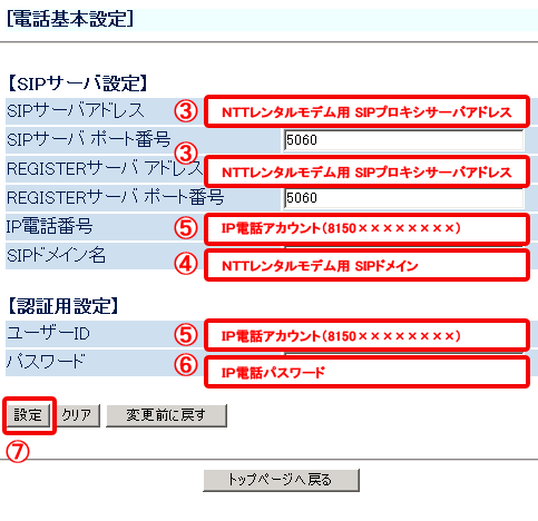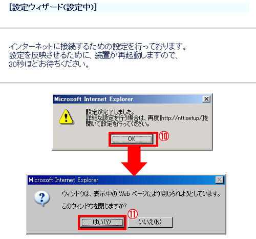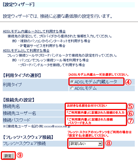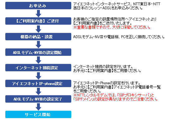 ADSLモデム-NVⅢ設定について ADSLモデム-NVⅢの設定手順は以下となります。 ■機器設定の流れ ADSLモデム-NVⅢを設定するにあたって、必要な情報が記載された「アイエフネットインターネットサービスご利用案内書」(以下では「ご利用案内書」と表記します)をお手元にご用意ください。 設定を開始する前には、機器が正しく接続されていることを確認してください。また、ADSLモデム-NVⅢのファームウェアが最新のものであることを確認してください。※最新ファームウェア情報は、NTT東日本サポート : バージョンアップ情報ページ(http://web116.jp/ced/support/version/broadband/adsl-nv3/index.html)を参照してください。 お申込みからサービス開始までの流れは以下のとおりです。 ■インターネット接続設定 1. Microsoft Internet ExplorerなどのWebブラウザを立ち上げ、アドレス欄に [http://ntt.setup/]と入力し、[Enter]キーを押してください。 2. [管理者パスワードの初期設定]画面が表示されたら、[管理者パスワードの初期設定]の[パスワード①]と[パスワード再入力②]に同じ内容を2回入力し[設定③]をクリックしてください。 パスワードは半角英数字、ハイフン(” – “)、アンダースコア(” _ “)が使用できます。 ※このパスワードは、ADSLモデムNVⅢの設定画面にアクセスするためのパスワードです。 3. [設定ウィザード]画面が表示されたら、以下のように入力してください。 ※ フレッツ・スクエアをご利用の場合はPPPoEセッションを1つ使用しますので、複数セッションご利用の場合はご注意ください。 4. [設定⑨]ボタンをクリックすると、ADSLモデムがリセットし、30秒程度で再起動します。 5. 再起動すると以下のような画面が表示されますので[OK⑩]をクリックし、「このウィンドウを閉じますか?」が表示されたら[はい⑪]をクリックしてください。 10. 再度、Webブラウザを立ち上げ、アドレスに[http://ntt.setup/]と入力し、[Enter]キーを押してください。 11. ログイン画面が表示されますので、[ユーザー名⑫]に「user」と入力し[パスワード⑬]に 2.で設定した「パスワード」を入力し、[OK⑭]ボタンをクリックしてください。 12. 左側の[基本設定]メニューから、(選択してください)の右側のした矢印▼(⑮)をクリックして、[接続先の選択設定⑯]を選択し、クリックしてください。 13. [接続先の選択設定]画面の[接続先の選択]から5.で作成した接続先の[接続可⑰]にチェックをし、[切替⑱]ボタンをクリックしてください。 14. 「接続先変更のため回線接続中は、回線が切断されます。よろしいですか?」と表示されるので、[OK]ボタンをクリックします。 15. 画面に「使用する接続先を切り替えました。」と表示されたら、インターネット接続の設定は完了です。 このままインターネットに接続する場合は、[登録]ボタンをクリックしてください。続けて、IP電話の設定を行う場合は、次のアイエフネットIP-Phone設定に進んでください。 ■アイエフネットIP-Phone設定 1. 左側の[電話設定]メニューから、(選択してください)の右側のした矢印▼(①)をクリックして、[電話基本設定②]を選択し、クリックしてください。 2. [電話基本設定]画面に以下のように入力してください。 3. [設定⑦]ボタンをクリックしてください。 4. [登録]ボタンをクリックしてください。ADSLモデム-NVⅢが30秒程度で再起動し、IP電話が利用できます。 ■設定確認 設定が完了したら、ADSLモデム-NVⅢのランプをご確認ください。下の表にあるような状態ならば、ご利用可能な状態です ランプ名称 状態 ADSL 点灯 (緑) PPP 点灯 (緑) VoIP 点灯 (緑) PWR 点灯 (緑) 制限事項 ・ 110、119などの“1”から始まる特番は自動的に一般回線を使用した発信に切り替わります。 ・ 0120、0990などの電話サービス及びPHS・ポケットベルへの発信については「0000(ゼロを4回)」を付けてダイヤルして下さい。 ・ 「発番号非通知」機能を利用した非通知発信はできません。必ず発番号通知の設定をしてください。また、”184”を付加した非通知発信もできません。 以上で、ADSLモデム-NVⅢの設定は完了です。