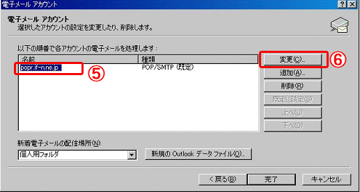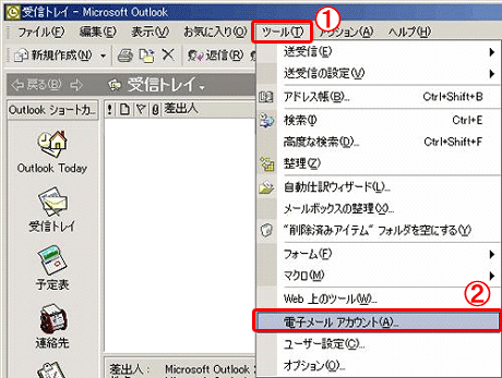 Microsoft Outlookが起動したら、メニューバーから[ツール①]→[電子メールアカウント②]をクリックしてください。