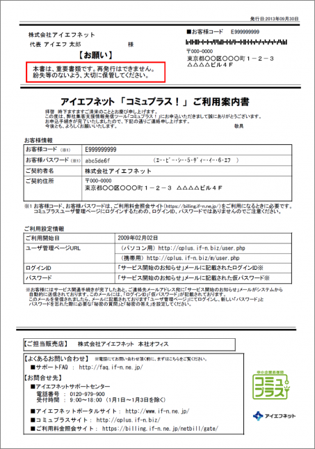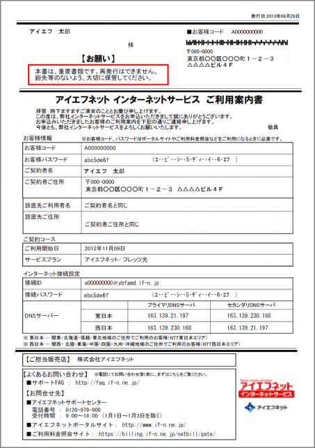 ご利用案内書とは、アイエフネットにご加入頂きましたお客様のご契約内容等を記載したA4サイズの書類となります。