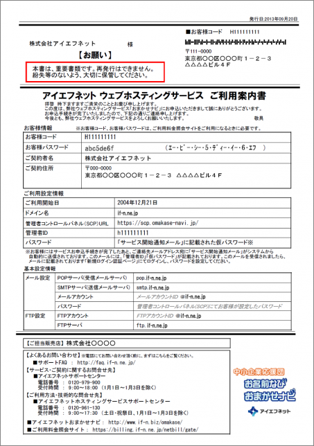 【アイエフネットウェブホスティングサービスご利用案内書の例】