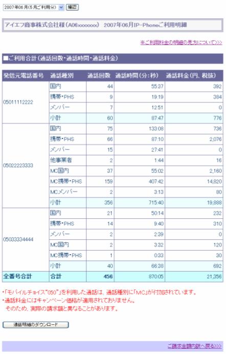 下記の通り、050 番号ごとに「モバイルチョイス050」の通話料金も掲載されます。